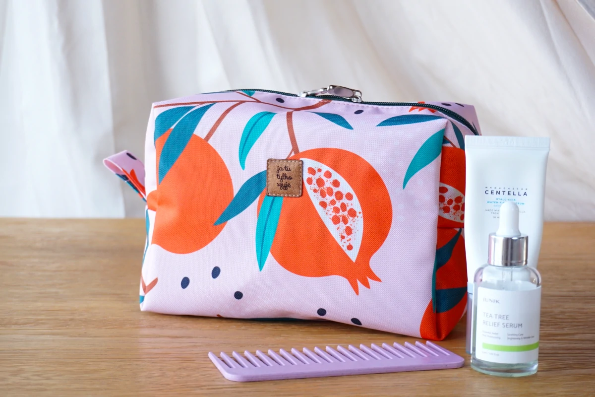 Szyta ręcznie z wodoodpornej tkaniny – z myślą o długim i wygodnym użytkowaniu. Sprawdzi się nie tylko na kosmetyki – także jako organizer do torby, etui na ładowarki lub mały kuferek na bieliznę.