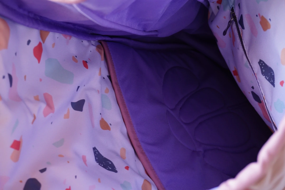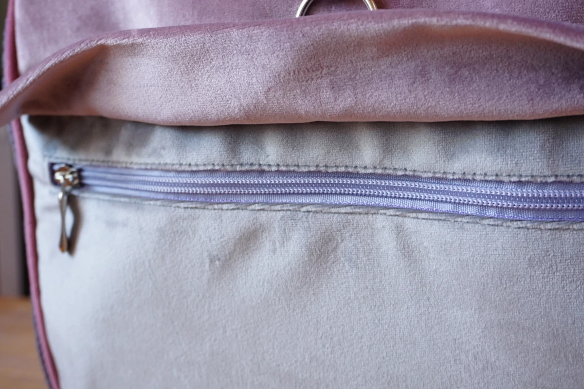 Z zewnątrz posiada kieszonkę zapinaną na zamek oraz wkładaną domykaną na magnes.